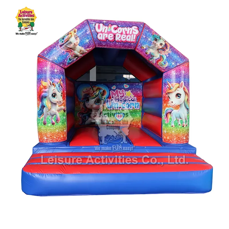 Мини надуваем надуваем замък A Frame Red Blue с покрив 13ftx10ftx9ft: Този надуваем надуваем замък от Leisure Activities® има класически дизайн на замък с червена и синя A-рамка. Той разполага с подвижен панел с произведения на изкуството, който се закрепва с велкро кука и велкро с примка, което позволява лесна взаимозаменяемост с различни теми като тема на еднорог, тема на зоологическа градина и др.